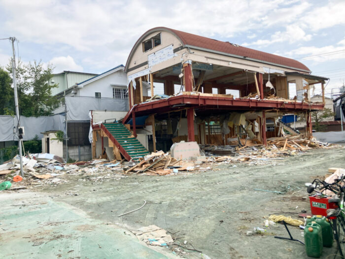 2階建て部分は構造材がむき出しになっており、段階的な解体が行われています