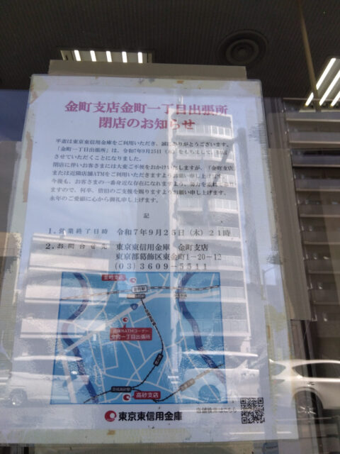 金町1丁目の「東京東信用金庫 金町支店金町一丁目出張所」が9/25(木)をもって閉店となりました。