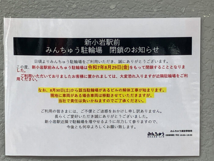 新小岩駅南口前の「葛飾南ビル」が解体へ、敷地内の「みんちゅう駐輪場」も8/29(金)をもって閉鎖