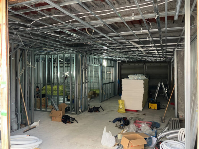 現地では内装工事が進められており、天井には金属製のフレームが設置され、壁面には軽量鉄骨の下地が組まれています。電気配線なども引かれており、本格的な改装工事が行われていることが確認できます。