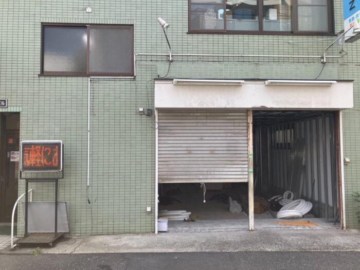 建物の外観を見ると、シャッターが上がった状態で工事が進められており、内部には建築資材や工具類が置かれています。通りに面した店舗スペースであることから、何らかの店舗が入居する可能性が高いと見られます。