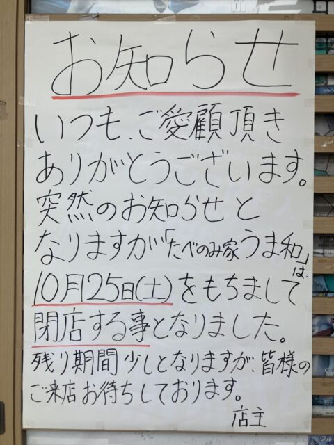 「お知らせ いつも ご愛顧頂きありがとうございます。突然のお知らせとなりますが『たべのみ家うま和』は、10月25日(土)をもちまして閉店する事となりました。残り期間少となりますが、皆様のご来店お待ちしております。店主」