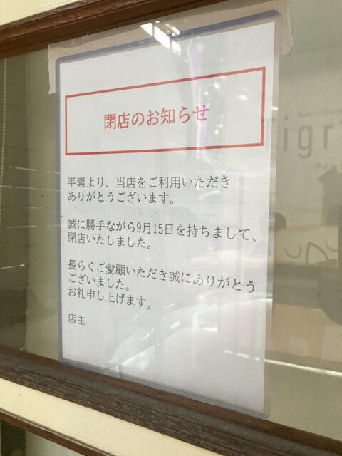 閉店の貼り紙には「誠に勝手ながら9月15日を持ちまして、閉店いたしました。長らくご愛顧いただき誠にありがとうございました。お礼申し上げます」と記されており、店主からの感謝の気持ちが伝わってきます。