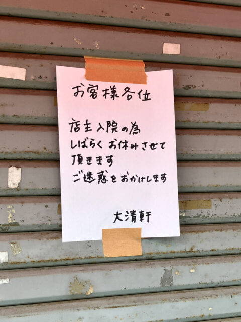 お店の貼り紙によると、店主の入院により、しばらくの間お休みされることになったようです。