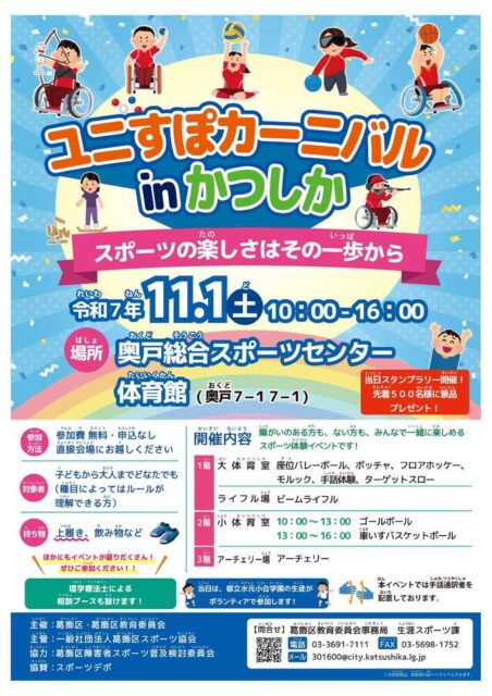 2025年11月1日(土)、奥戸総合スポーツセンター体育館にて「ユニすぽカーニバルinかつしか」が開催され、誰もが参加できるユニバーサルスポーツの魅力を存分に味わえます。