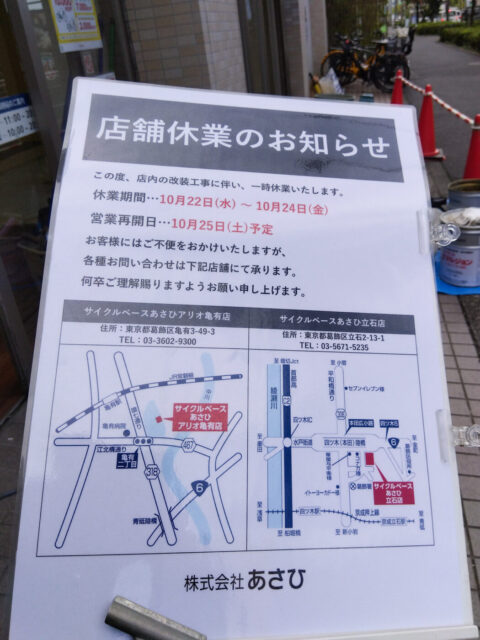 金町1丁目・水戸街道沿いの「サイクルベースあさひ葛飾金町店」が10/25(土)改装リニューアルオープン予定、信用金庫跡を拡張させるみたい