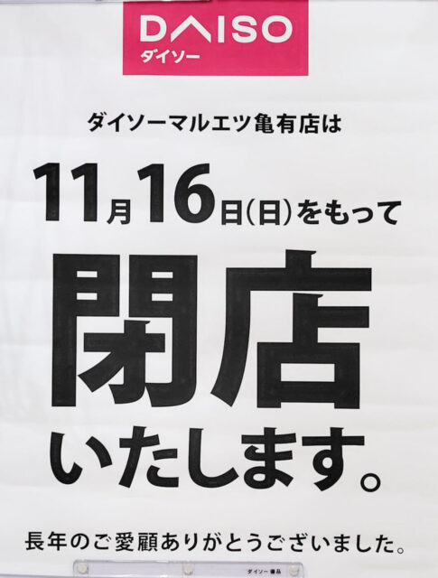 「ダイソー マルエツ亀有店」が11/16(日)をもって閉店される事が分かりました。