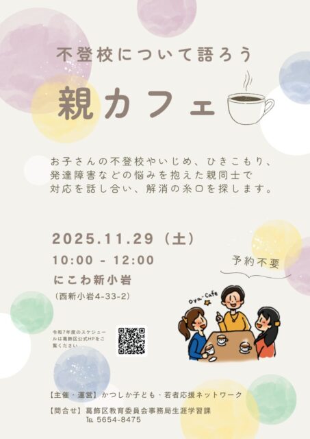 11/29(土)にこわ新小岩にて、不登校について語ろう「親カフェ」が開催されます。