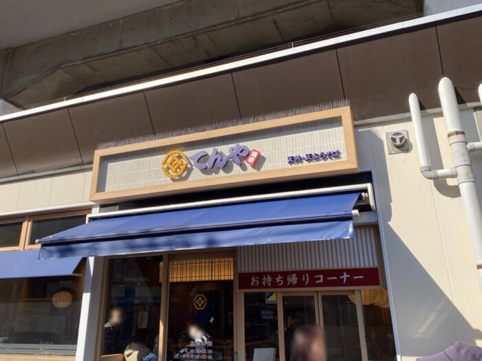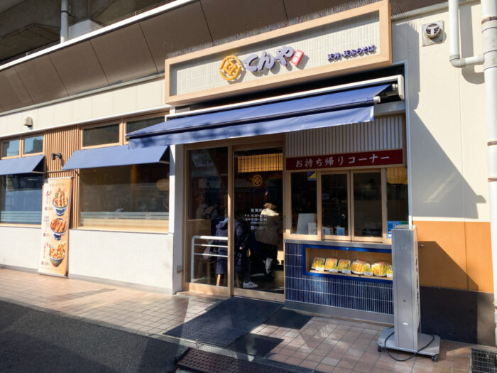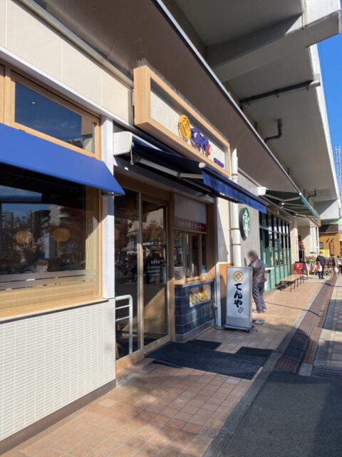 店舗の外観を見ると、看板デザインも一新されており、従来の青い看板に「天丼・天ぷらそば てんや」の新しいロゴが配置されています。「お持ち帰りコーナー」の表示も分かりやすく設置され、テイクアウト需要にも配慮した作りとなっています。