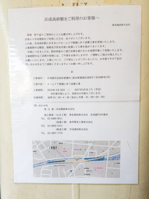 京成高砂駅でホームドア設置工事が現在進行中であることが、駅構内に掲示された工事のお知らせで明らかになりました。