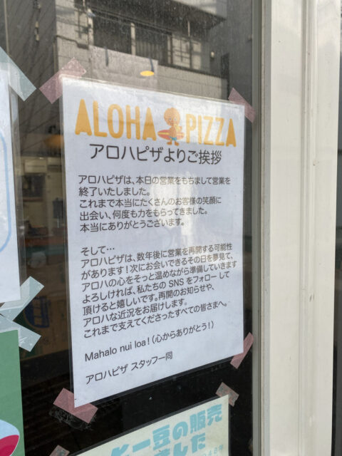 立石4丁目の「アロハピザ」が12/8(月)をもって閉店、数年後の営業再開に希望を託しつつ幕を下ろしました