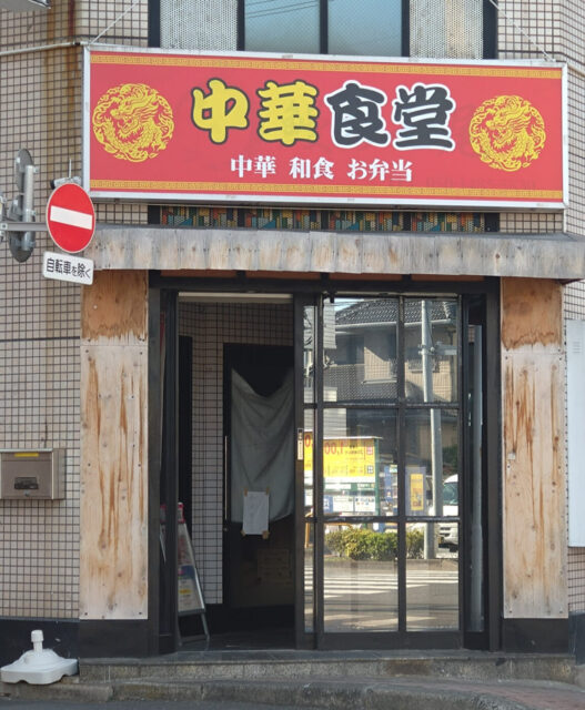 現在、この物件には「中華食堂」と書かれた看板が設置されています。看板のデザインは、赤色を基調とした背景に金色の龍の装飾が施されており、「中華 和食 お弁当」の文字も確認できます。