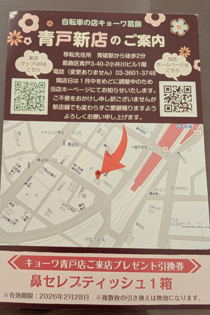 「自転車の店キョーワ 葛飾白鳥店」が建物老朽化により12/28(日)をもって閉店、1月中に青戸に移転予定