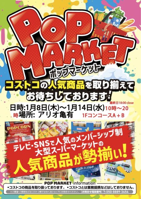 1/8(木)〜1/14(水)アリオ亀有にて「POP MARKET(コストコ再販店)」期間限定出店