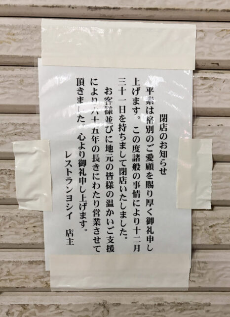 高砂駅前の老舗洋食店「レストラン ヨシイ」が休業から再開される事なく12/31(水)をもって閉店、65年の歴史に幕
