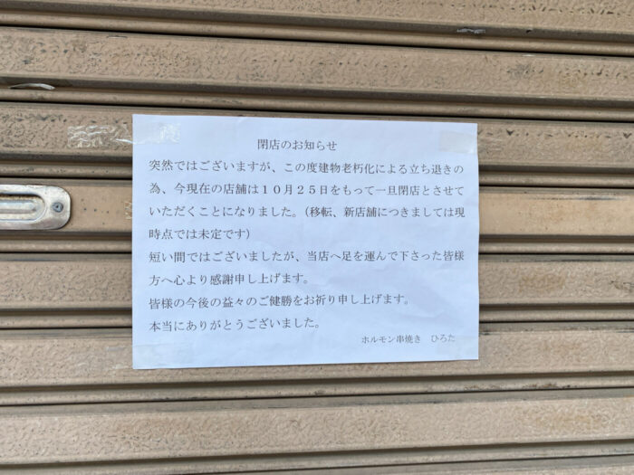 新小岩2丁目の「ホルモン串焼き ひろた」が建物老朽化により10/25(土)をもって一旦閉店へ
