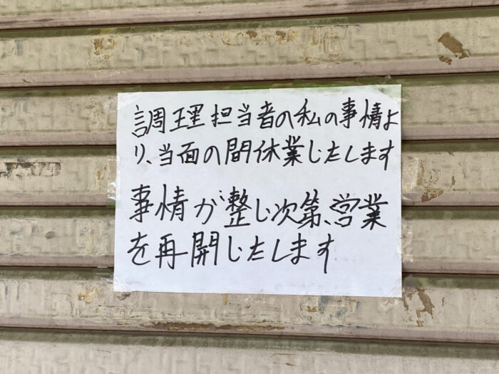 亀有5丁目の中華料理「厨食長」が当面の間休業に、調理担当者に何があった?