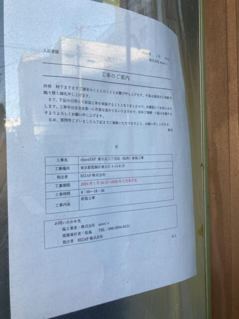 フィットネスジム「chocoZAP 東立石三丁目店」ファミーユ跡地にオープン準備中、2026年3月ごろ開業か
