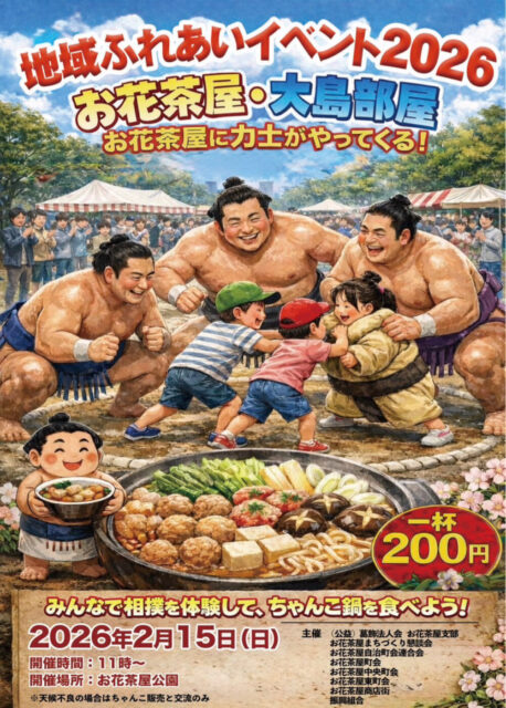2/15(日)お花茶屋公園にて「地域ふれあいイベント2026」が開催、大島部屋の力士がやってくる!ちゃんこ鍋が1杯200円