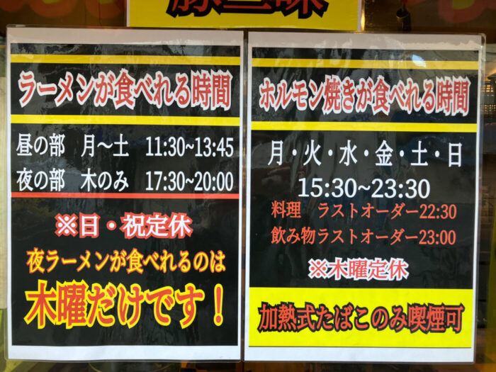 お昼と木曜の夜のみラーメンが提供、他の夜はホルモン焼きのお店となっています。
