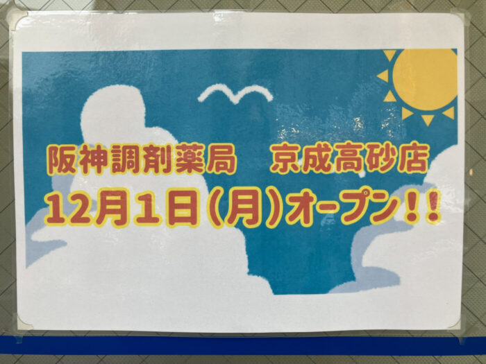 高砂2丁目に12月1日(月)、「阪神調剤薬局 京成高砂店」がオープンしています。