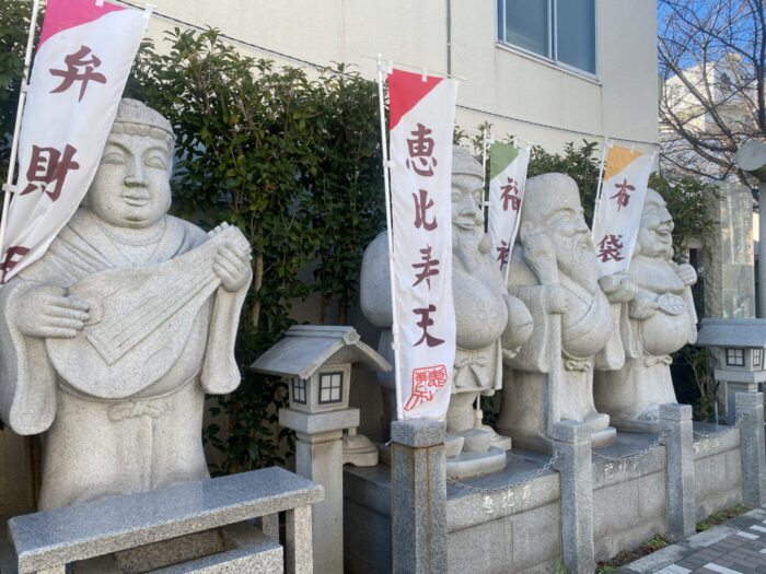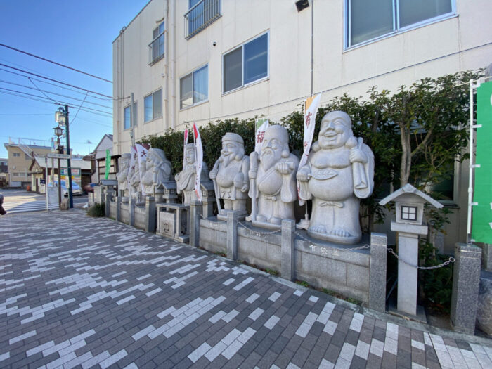こちらは堀切天祖神社の境外末社「菖蒲七福神」で、恵比寿、大黒天、毘沙門天、弁財天、布袋尊、福禄寿、寿老人の7体の石像が、訪れる人々を温かく迎えています。