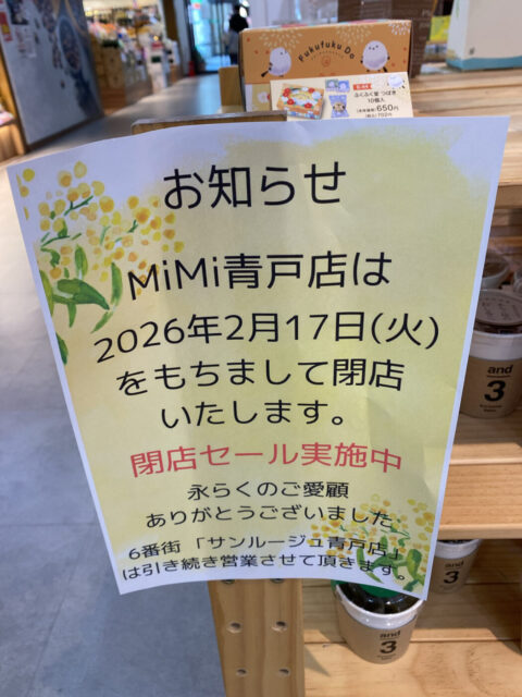 ユアエルム青戸店5番街の生活雑貨・食器の「MiMi 青戸店」が2/17(火)をもって閉店となります。