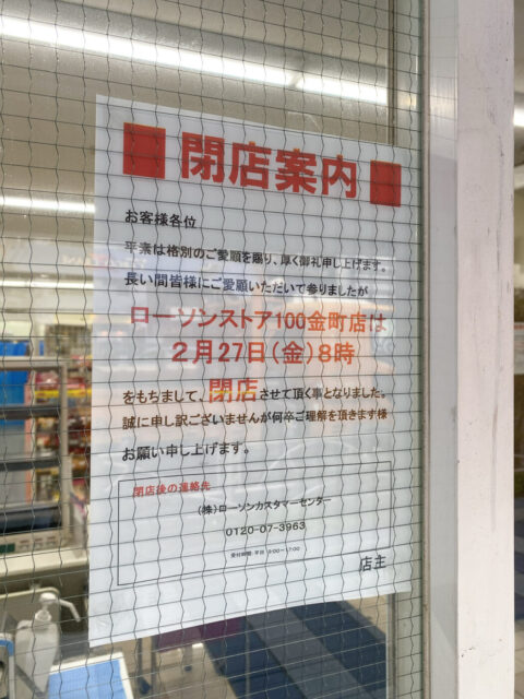 金町で営業している「ローソンストア100 金町店」が、2026年2月27日(金)8時をもって閉店することが発表されました。