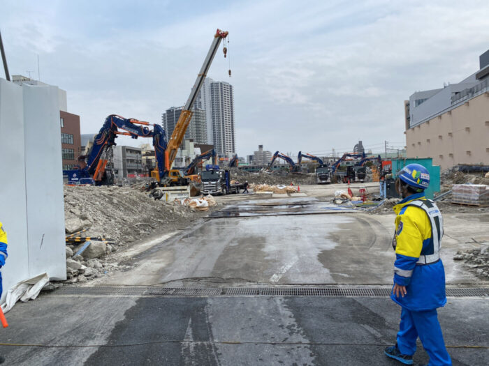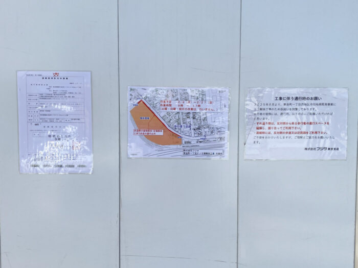工事エリア周辺には通行への配慮を求める案内も掲示されており、工事期間中は周辺住民や通行者への安全対策が講じられています。