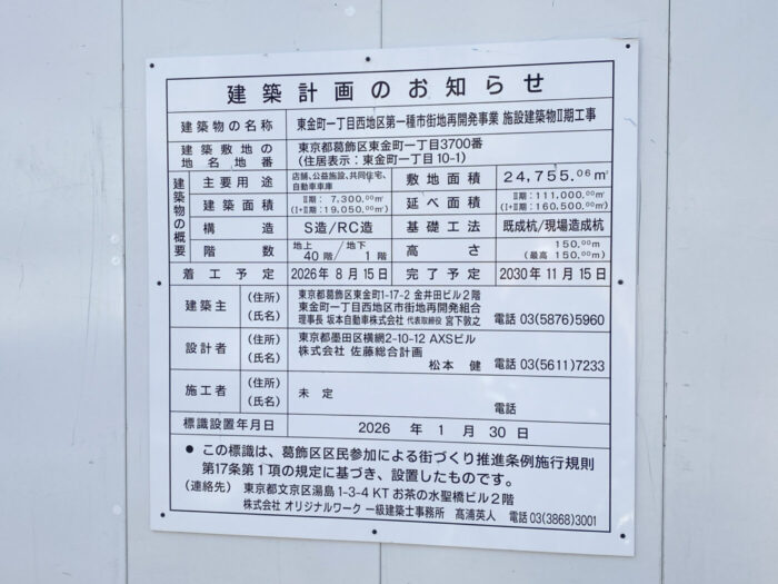 建築計画のお知らせによると、第2期工事で建設されるのは地上40階・地下1階建ての施設で、延べ床面積は約11万平方メートルに及びます。着工予定は2026年8月15日、完了予定は2030年11月15日となっています。