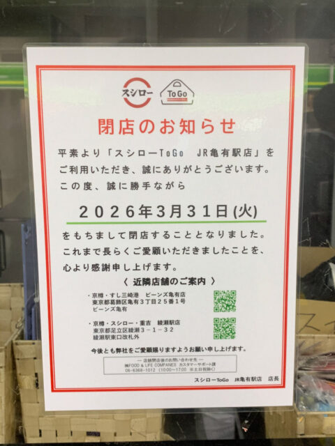 亀有駅改札前のテイクアウト専門店「専門「スシロー To Go JR亀有駅店」が3/31(火)に閉店していました。