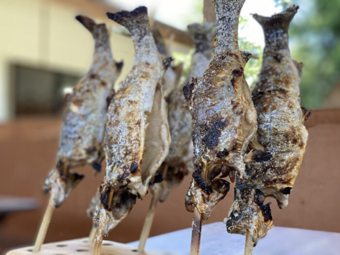 自分で釣ったニジマスをその場で焼いて塩焼きにして楽しむ事ができます。