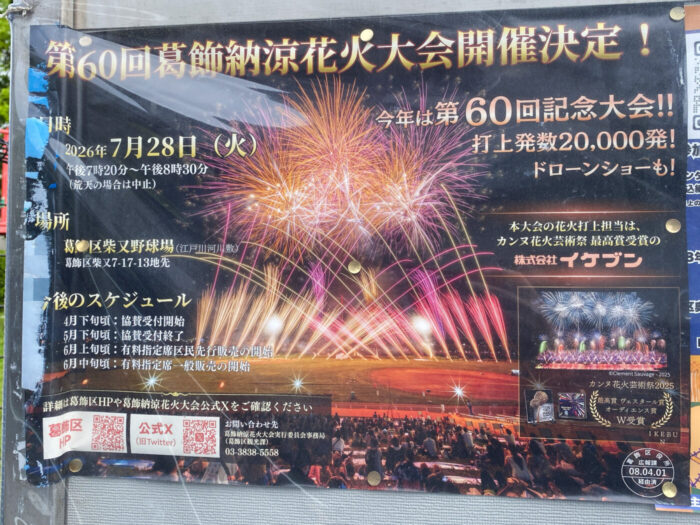 葛飾区柴又野球場(江戸川河川敷)にて、2026年7月28日(火)に「第60回葛飾納涼花火大会」が開催されます。