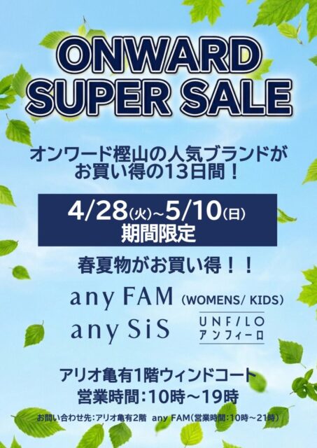 4/28(火)〜5/10(日)アリオ亀有にて「ONWARD SUPER SALE」が出店します。